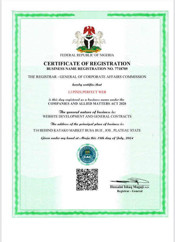 Before or after you contact J-TECH Nigeria, kindly note that we're legally registered business under the Corporate Affairs Commission (CAC) of Nigeria. Transparency and trust are core to how we operate. Click below to view our official registration certificate and verify our credibility.